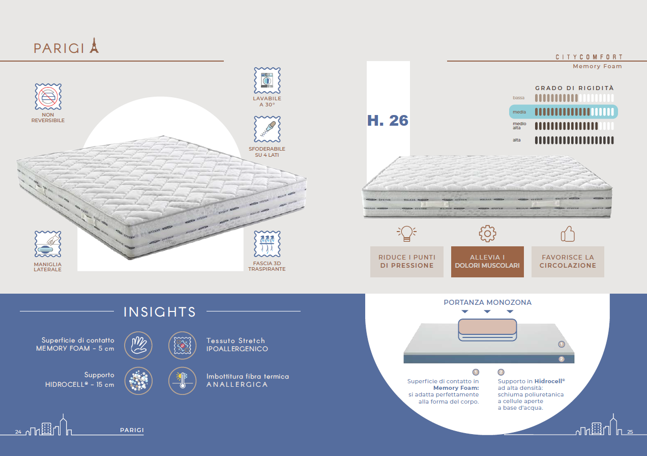 Il modello Parigi combina la resistenza strutturale del poliuretano espanso in Hidrocell®, materiale innovativo a base acquosa, con l’elevatissima capacità adattiva e